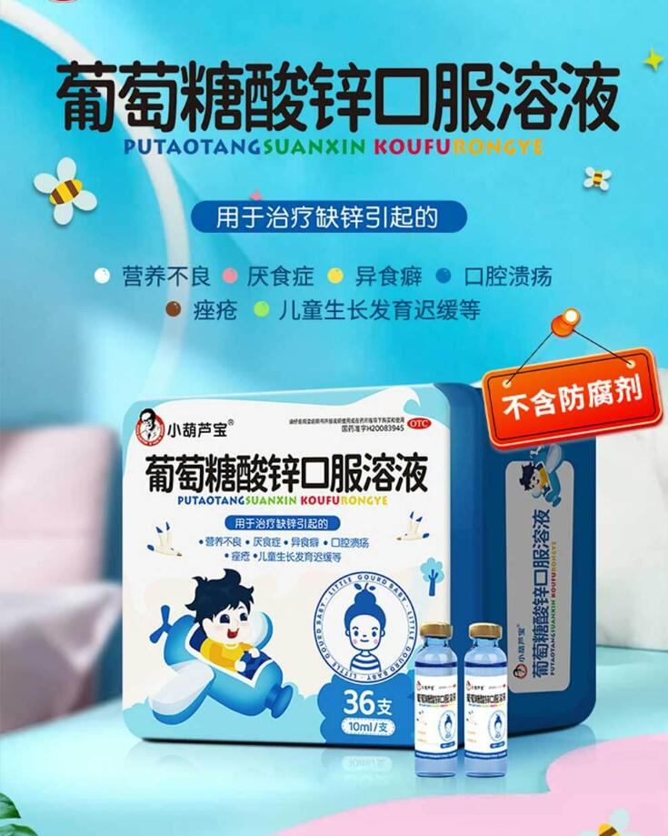 本品每毫升含主要成份葡萄酸鋅3.5毫克(相當于鋅0.5毫克),輔料為枸櫞酸、蔗糖、香精。